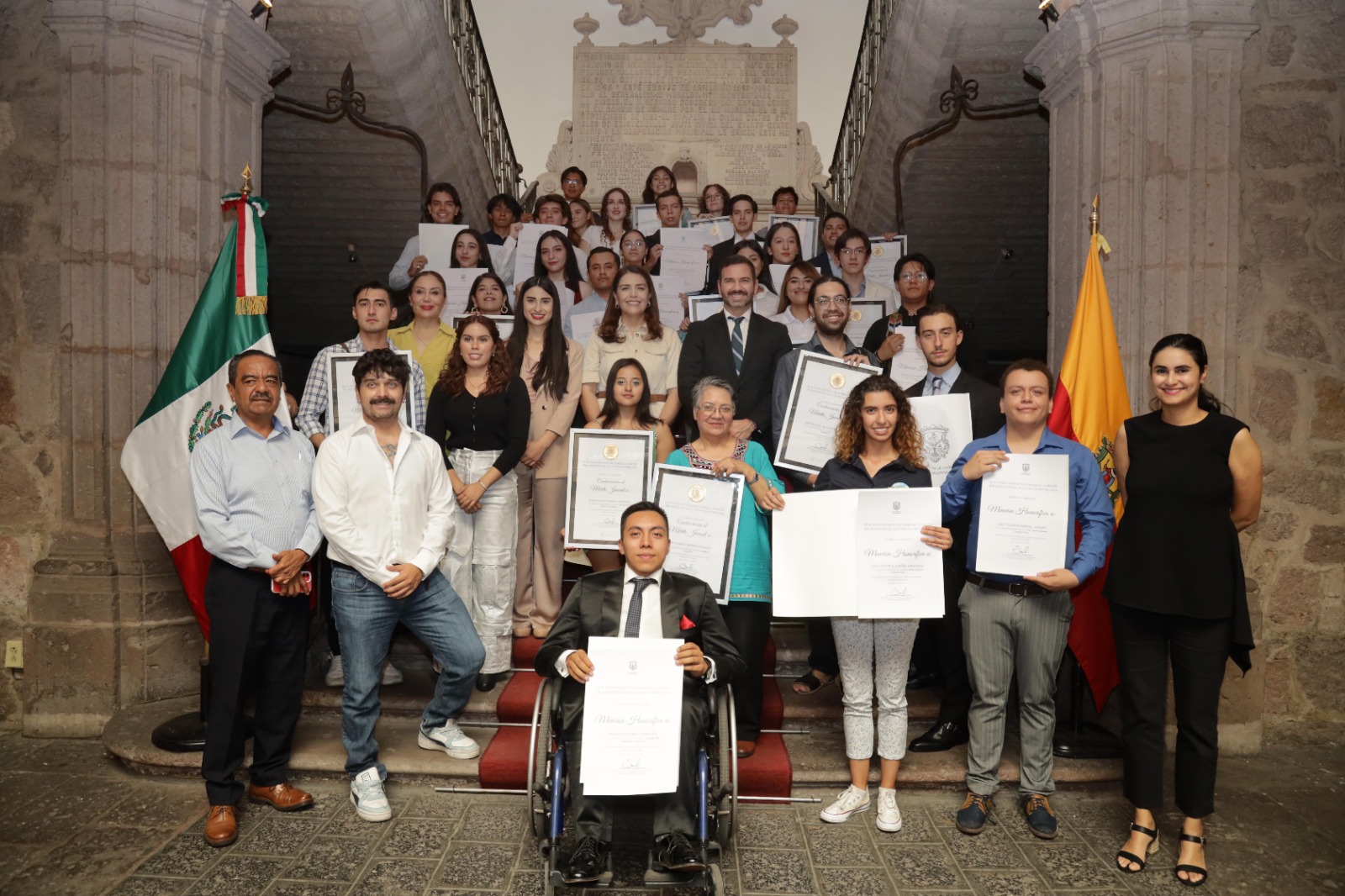 Morelia, Michoacán, a 23 de mayo de 2024.- Este jueves, el Ayuntamiento de Morelia llevó a cabo la entrega de reconocimientos al Mérito Juvenil 2024, un evento que destaca las contribuciones y logros de las y los jóvenes morelianos.