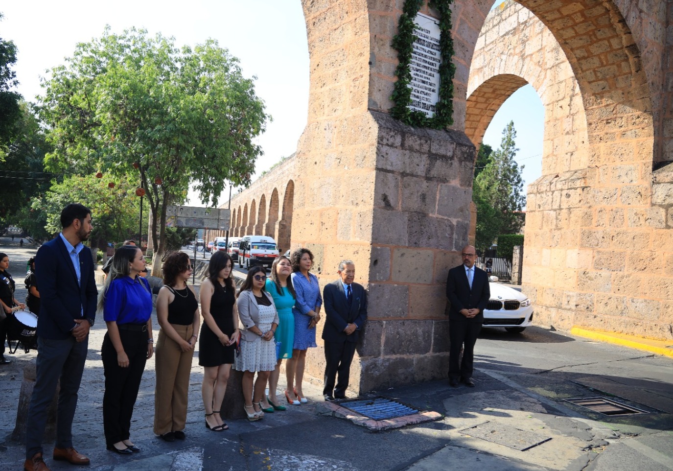 En ese sentido, personal del Colegio de Morelia del Ayuntamiento de Morelia encabezados por su director general, Iván Barrales Alcántara, montaron guardia de honor y depósito de ofrenda floral en la placa conmemorativa ubicada al inicio del Acueducto para recordar a este ilustre personaje.