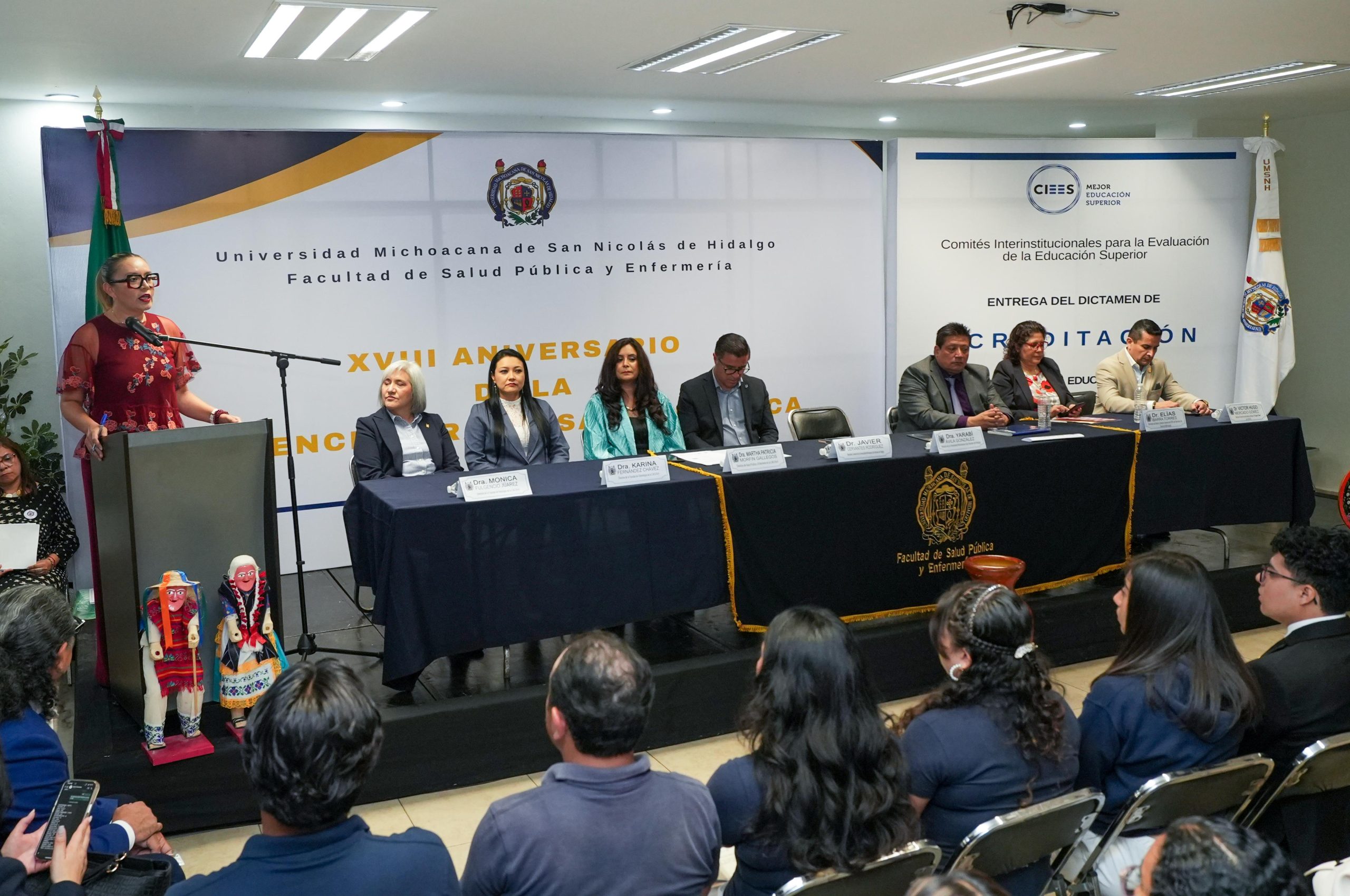 En tanto, la directora de la Facultad de Salud Pública y Enfermería, Martha Patricia Morfín Gallegos, indicó que la acreditación es el resultado del trabajo intenso tanto de alumnas, alumnos, de las y los profesores y de empleados administrativos, de igual forma, agradeció el apoyo de la rectora Yarabí Ávila para que se lograran estos objetivos. En este marco, felicitó a la comunidad de la dependencia a su cargo por el 18 aniversario de su fundación, “orgullo nicolaita por su gran trayectoria académica, formando profesionales de Salud Pública con ética y humanismo”.