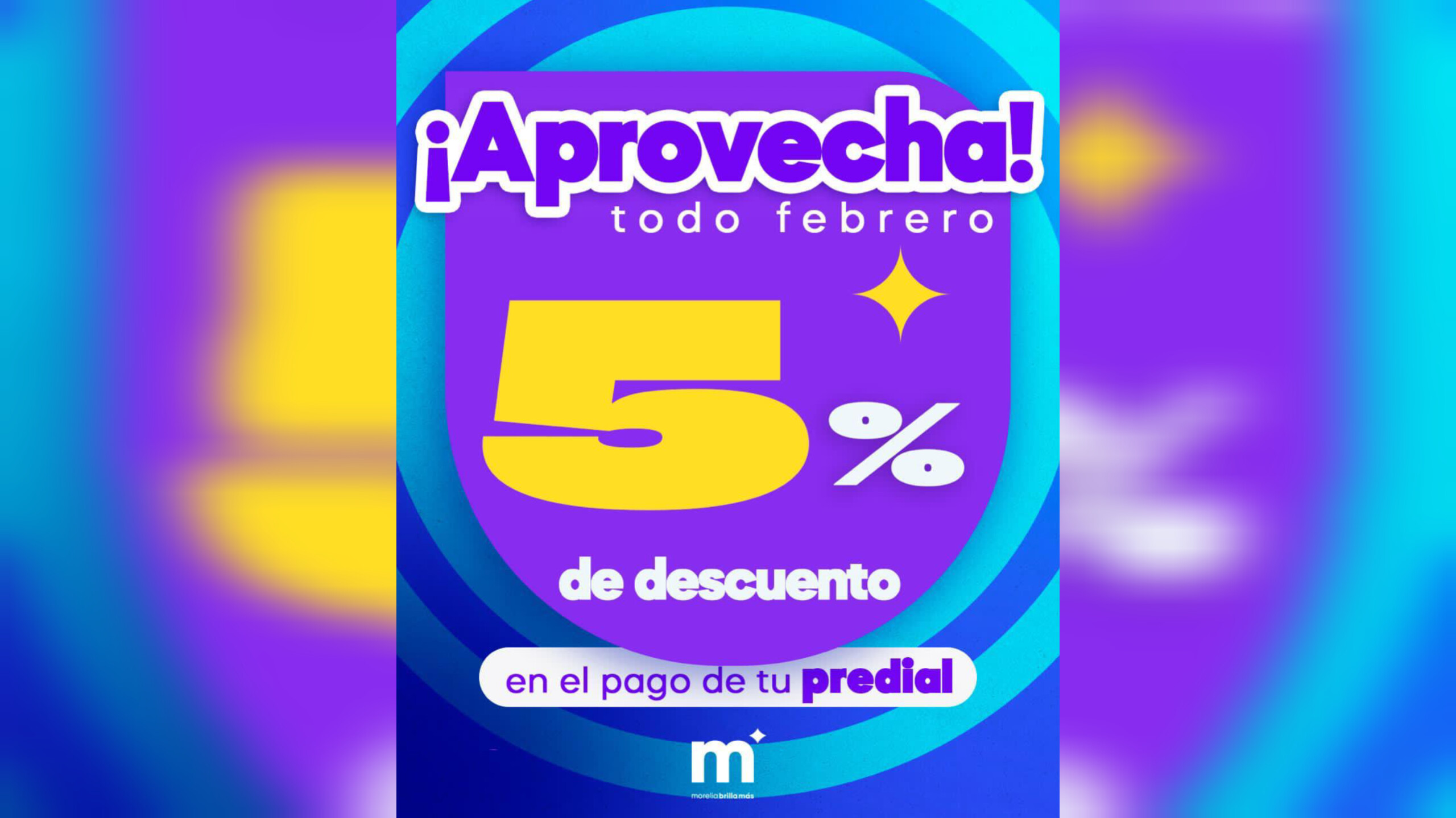Morelia, Michoacán, 15 de febrero de 2026.– El Ayuntamiento de Morelia recuerda a la ciudadanía que durante febrero continúa el 5 por ciento de descuento en el pago del predial, como una medida de apoyo a la economía familiar, y un incentivo para cumplir oportunamente con esta contribución, la cual permite fortalecer los servicios públicos y el desarrollo del municipio.