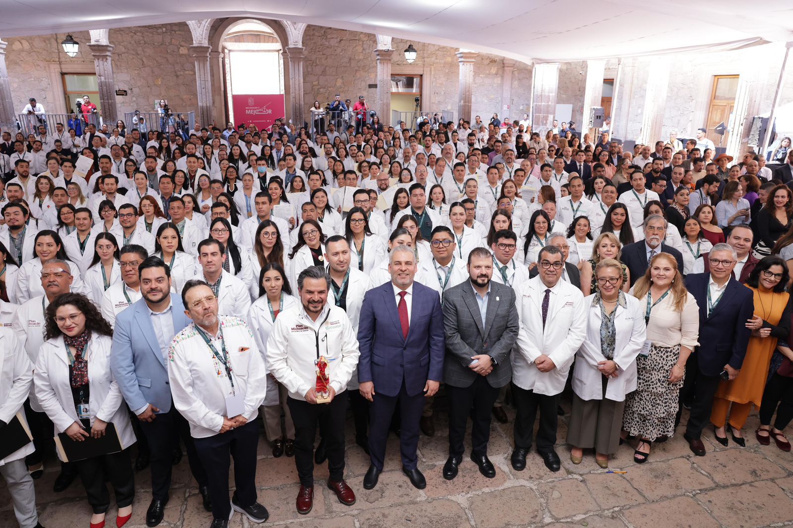 Durante la entrega de plazas a 407 médicas y médicos especialistas del IMSS, el mandatario destacó que el nuevo hospital, que estará ubicado en el poniente de Morelia, se edifica sobre una superficie de 60 mil metros cuadrados, de los cuales, 45 mil fueron donados por el Gobierno de Michoacán y 15 mil por el Ayuntamiento de Morelia, lo que elevará la capacidad y la calidad de la atención médica para las personas derechohabientes.